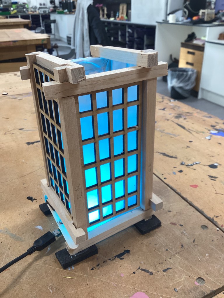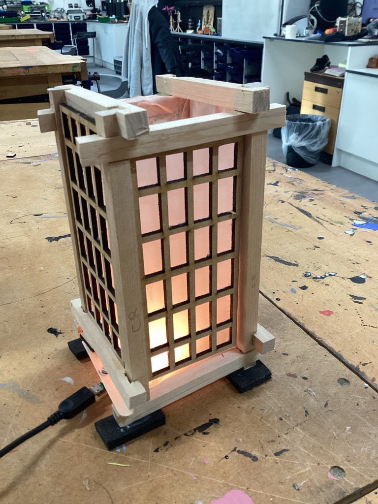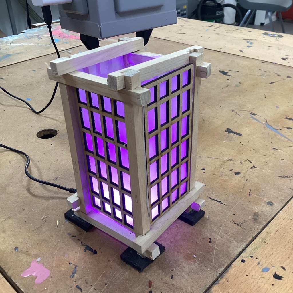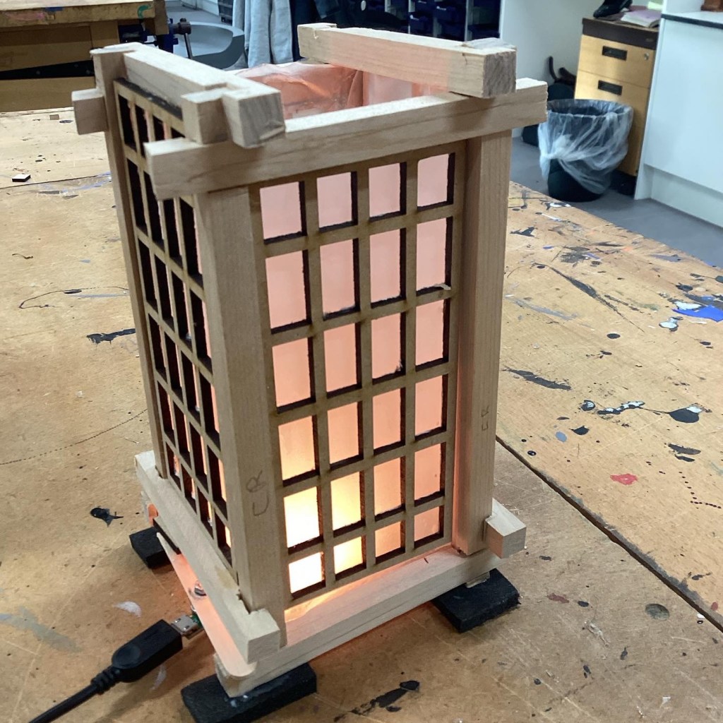 This project was a combination of traditional woodworking skills and computer aided design to create a desk lamp, inspired by the Kumiko style of japanese carpentry. Pupils learnt how to create simple lap joints using a chisel and some very accurate measuring and cutting. They created a frame using 12 pieces of 10mm hardwood squares. They then used TinkerCAD to create designs for the panels which were either 3D printed or lasercut. Vellum paper was used to diffuse the lights and a pre-programmed RGB LED from Kitronik provided the light source.